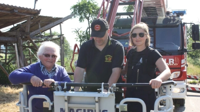 In Weißenkirchberg und Hetzweiler geht es mit Drehleiter, Handschuhen und Gehstock hinauf. Eine 93-jährige Anwohnerin fährt 28 Meter mit hinauf.